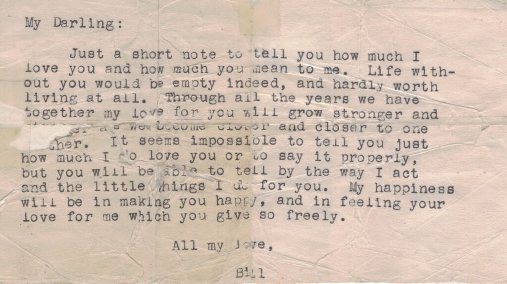 Mom was laid to rest at the Rose Hill Cemetary in Upper Dublin, PA next to her husband, Bill. One of the items placed in her grave was a note from our Dad that Mom kept in her wallet till she died.