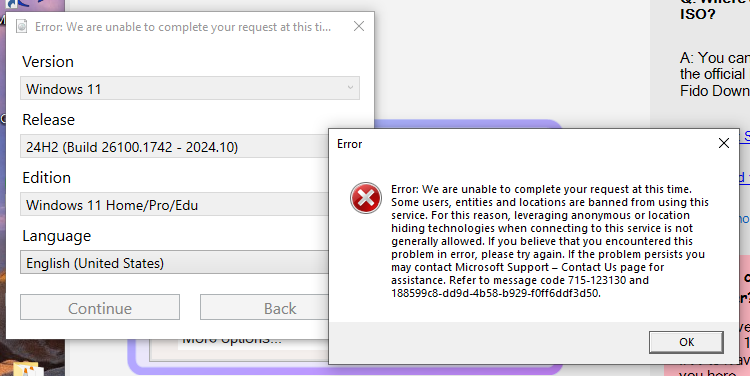 I just completed my 3rd upgrade from Windows 10 to 11, this time on an older Dell Inspiron 15 laptop. This upgrade didn’t go as smootly as the others since Microsoft apparently doesn’t like people to download the .iso required for the upgrade more than a couple times from a given location (likely based on IP address). Here’s the error I received: